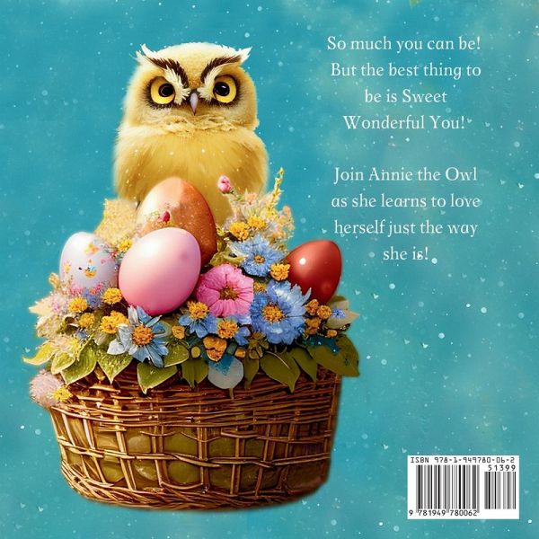 Annie the Wannabe Easter Owl is a heartwarming story about Annie, a young owl who feels perfectly fine about herself until Easter approaches. She starts to dream of being pink like the bunny or fluffy like the chick. She could wear wooly feathers and be like a lamb, or maybe even go green easter grass glam! She could even develop a brand-new habit and make use of her time by helping the rabbit! Annie gets so excited that she can't decide who or what she should be. She wants to be loved as much as her Easter friends, so she turns to Wise Owl for help. After humorously showing her how confusing it can be to try to be everyone else, Wise Owl lovingly helps Annie see that, The very best thing you could ever be... and the very best thing you could ever do... Is Be Who You Are! Sweet Wonderful You! Annie realizes that she loves being an owl after all and encourages young readers to love and accept themselves. Included is a surprise visit from one of Annie's friends and a little Optional Wise Owl "Fun-Work" at the end that encourages kids to think about why they are happy to be themselves. Teach your children the power of Self-Acceptance & Self-Love In a world that often emphasizes conformity, it's important for children to learn to embrace their individuality. By watching Annie's journey of self-discovery, your child will learn that the most important thing they can be is themselves. Research and common sense demonstrate that children who love and accept themselves are more likely to have healthy relationships, exhibit positive coping skills, and have greater life satisfaction. An awesome social-emotional learning (SEL) book for self-esteem & self-acceptance The delightful rhyming tale with beautiful (and often humorous) illustrations will take your child on a journey of self-awareness and help them appreciate their uniqueness. Your child can empathize with Annie's confusion and urgency as she tries to figure out who she should be. They'll feel the relief, peace, and happiness that come when she learns to love herself. The book is a celebration of diversity as well as the power of positive relationships and responsible decision-making. A Wise and Adorable Role Model Who Teaches by Example Annie provides children with positive examples of how to handle difficult situations, like feeling left out or wishing to be someone else. Annie will teach your child, by example, to embrace diversity, love being themselves, and manage strong emotions in a positive way. Optional Wise Owl Exercise to Promote Self Love An optional exercise is included in the book for children to list all they love about being themselves, fostering self-confidence and self-esteem. Intended for children aged 3-6 years old, the positive message and adorable illustrations delight the inner child in those of all ages!