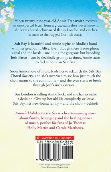 ‘An idyllic, beautifully written, heart-warming story that made my heart swell with joy… Absolutely beautiful; I love everything about this book.’ The Writing Garnet Blog, 5 stars When twenty-nine-year-old Annie Trebarwith receives an unexpected letter from a great-aunt she’s never known, she leaves her shoebox-sized flat in London and catches a train to the rugged Cornish coast. Salt Bay is beautiful and Annie begins to kindle a bond with her great-aunt Alice. Even though there is zero phone signal and the locals – including the gorgeous but brooding Josh Pasco – can be decidedly grumpy at times, Annie starts to feel at home in Salt Bay. Soon Annie’s love of music leads her to relaunch the Salt Bay Choral Society, and she’s surprised to see how just much the choir means to the community – and she even starts to break through Josh’s surly exterior… But London is calling Annie back, and she has to make a decision. Give up her old life completely, or leave Salt Bay, her new-found family – and the choir – behind? Annie’s Holiday by the Sea is a heart-warming story about family, belonging and the healing power of music, perfect for fans of Jo Thomas, Holly Martin and Carole Matthews. Read what everyone is saying about Annie’s Holiday by the Sea: ‘Everything about this book was just perfect… I got such a good feeling from this book within the first few chapters and I totally fell in love with Salt Bay and its residents… A simply brilliant read that left me wondering why haven't we heard from this author before… It was more than worth the wait as I loved, loved this book.’ Shaz’s Book Blog ‘A breath of fresh air… I knew I was going to love this book and I wasn't wrong. This is without a doubt a fabulous read and one that will no doubt get this author a huge following as I for one can not wait to read more by her.’ By The Letter Book Reviews, 5 stars ‘I absolutely fell in love… A totally outstanding debut that made me giggle and maybe even tear up a few times, I highly recommend this book for anyone looking for a super fun, light read.’ Novel Gossip, 5 stars ‘Hilarious… A charming, heart-warming and enjoyable read about love, hope, and opening yourself up to happiness. Annie is such a funny and wonderful character… I really couldn't get enough of the Salt Bay community… Everything you want in a contemporary novel, and its sharp wit and excellent narrative makes it truly shine. I can't wait to return to Salt Bay. Go and buy this book!!!!!’ Books of All Kinds, 5 stars