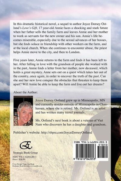 In this dramatic historical novel, a sequel to author Joyce Dorsey Ostlund's Love's Gift,17 year-old Annie faces a shocking and stark future when her father sells the family farm and leaves Annie and her mother to work as servants for the new owner and his son. Annie's life becomes miserable, especially due to the sexual advances of her bosses, but she finds solace in friendship with other workers on the farm, and at the local church. When she continues to encounter abuse, the priest helps Annie move to the city, and then to London. Five years later, Annie returns to the farm and finds it has been left to her. After falling in love with the grandson of people she worked with in the past, Annie finds a letter from her mother, now deceased, which holds a great mystery. Anne sets out on a quest which takes her out of the country, once again, in order to uncover the truth of the past. Can she and her new love conquer the obstacles that threaten to keep them apart? Will Annie be able to keep the farm and live out her dreams? About the Author: Joyce Dorsey Ostlund grew up in Minneapolis, MN and currently resides outside of Minneapolis in Chanhassen, where she is retired. Ms. Ostlund is an artist and has written many travel journals. Ms. Ostlund's next book is about a veteran of Viet Nam who discovers he has a daughter and grandson. Publisher's website: http://sbpra.com/JoyceDorseyOstlund