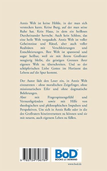 Annis Welt ist keine Höhle, in der man sich verstecken kann. Keine Burg, auf der man seine Ruhe hat. Kein Haus, in dem ein heilloses Durcheinander herrscht. Auch kein Schloss, das eine heile Welt vorgaukelt. Annis Welt ist voller Geheimnisse und Rätsel, aber auch voller Realitäten mit Verschleierungen und Entschleierungen. Ihre Welt ist spannend und sogar heilbar, weil sie mit ihrem Großvater neugierig bleibt, die geistigen Grenzen ihrer eigenen Welt zu überschreiten. Und so der schöpferischen Liebe Gottes im Horizont des Lebens auf die Spur kommt. Der Autor lädt den Leser ein, in Annis Welt einzutreten - ohne moralischen Zeigefinger, ohne missionarischen Eifer und ohne dogmatische Belehrungen.Aber mit Fingerspitzengefühl und Vernunftgründen sowie mit Hilfe von theologischen und philosophischen Impulsen und Perspektiven. Um sich in Annis Rolle oder in die des Großvaters hineinversetzen zu können und sie mit neuem, auch eigenem Leben zu füllen.
