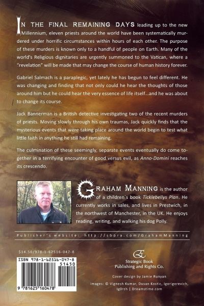 In the final remaining days leading up to the new Millennium, eleven priests around the world have been systematically murdered under horrific circumstances within hours of each other. The purpose of these murders is known only to a handful of people on Earth. Many of the world's Religious dignitaries are urgently summoned to the Vatican, where a "revelation" will be made that may change the course of human history forever. Gabriel Salmach is a paraplegic, yet lately he has begun to feel different. He was changing and finding that not only could he hear the thoughts of those around him but he could hear the very essence of life itself...and he was about to change its course. Jack Bannerman is a British detective investigating two of the recent murders of priests. Moving slowly through his own traumas, Jack quickly finds that the mysterious events that were taking place around the world begin to test what little faith in anything he still had remaining. The culmination of these seemingly, separate events eventually do come together in a terrifying encounter of good versus evil, as Anno-Domini reaches its crescendo. Graham Manning is the author of a children`s book Ticklebellys Plan. He currently works in sales, and lives in Prestwich, in the northwest of Manchester, in the UK. He enjoys reading, writing, and walking his dog Polly. Publisher's website: http://sbpra.com/GrahamManning