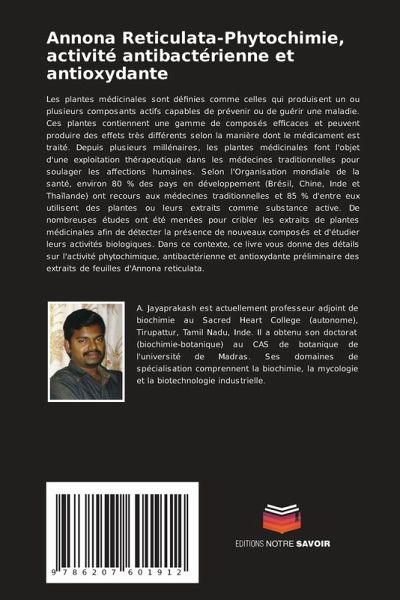 Les plantes médicinales sont définies comme celles qui produisent un ou plusieurs composants actifs capables de prévenir ou de guérir une maladie. Ces plantes contiennent une gamme de composés efficaces et peuvent produire des effets très différents selon la manière dont le médicament est traité. Depuis plusieurs millénaires, les plantes médicinales font l'objet d'une exploitation thérapeutique dans les médecines traditionnelles pour soulager les affections humaines. Selon l'Organisation mondiale de la santé, environ 80 % des pays en développement (Brésil, Chine, Inde et Thaïlande) ont recours aux médecines traditionnelles et 85 % d'entre eux utilisent des plantes ou leurs extraits comme substance active. De nombreuses études ont été menées pour cribler les extraits de plantes médicinales afin de détecter la présence de nouveaux composés et d'étudier leurs activités biologiques. Dans ce contexte, ce livre vous donne des détails sur l'activité phytochimique, antibactérienne et antioxydante préliminaire des extraits de feuilles d'Annona reticulata.