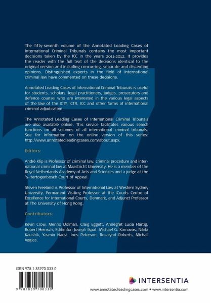 The fifty-seventh volume of the Annotated Leading Cases of International Criminal Tribunals contains the most important decisions taken by the ICC in the years 2011-2012. It provides the reader with the full text of the decisions identical to the original version and including concurring, separate and dissenting opinions. Distinguished experts in the field of international criminal law have commented on these decisions.