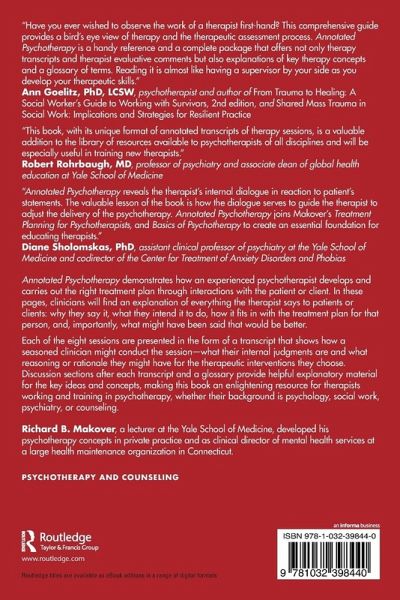 "Annotated Psychotherapy reveals the therapist's internal dialogue in reaction to patient's statements. The valuable lesson of the book is how the dialogue serves to guide the therapist to adjust the delivery of the psychotherapy. Annotated Psychotherapy joins Makover's Treatment Planning for Psychotherapists, and Basics of Psychotherapy to create an essential foundation for educating therapists."