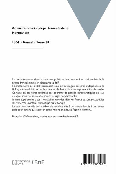 Annuaire des cinq départements de la Normandie / publié par l'Association normande Date de l'édition originale: 1864 La présente revue s'inscrit dans une politique de conservation patrimoniale de la presse française mise en place avec la BnF. Hachette Livre et la BnF proposent ainsi un catalogue de titres indisponibles, la BnF ayant numérisé ces publications et Hachette Livre les imprimant à la demande. Certains de ces titres reflètent des courants de pensée caractéristiques de leur époque, mais qui seraient aujourd'hui jugés condamnables. Ils n'en appartiennent pas moins à l'histoire des idées en France et sont susceptibles de présenter un intérêt scientifique ou historique. Le sens de notre démarche éditoriale consiste ainsi à permettre l'accès à ces revues sans pour autant que nous en cautionnions en aucune façon le contenu. Pour plus d'informations, rendez-vous sur www.hachettebnf.fr