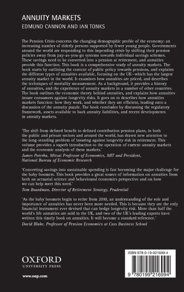 The Pension Crisis concerns the changing demographic profile of the economy: an increasing number of elderly persons supported by fewer young people. Governments around the world are responding to this impending crisis by shifting their pension policies away from pay-as-you-go systems towards individual savings schemes. These savings need to be converted into a pension at retirement, and annuities provide this function. This book is a comprehensive study of annuity markets. The book starts by outlining the context of public policy towards pensions, and explains the different types of annuities available, focusing on the UK which has the largest annuity market in the world. It examines how annuities are priced, and describes the techniques of mortality measurement. As a background, it provides a history of annuities, and the experience of annuity markets in a number of other countries. The book outlines the economic theory behind annuities, and explains how annuities insure consumers against longevity risks. It goes on to describes how annuities markets function: how they work, and whether they are efficient, leading onto a discussion of the annuity puzzle. The book concludes by discussing the regulatory framework, assets available to back annuity liabilities, and recent developments in annuity markets.