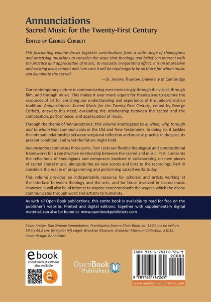 Our contemporary culture is communicating ever-increasingly through the visual, through film, and through music. This makes it ever more urgent for theologians to explore the resources of art for enriching our understanding and experience of the Judeo-Christian tradition. Annunciations: Sacred Music for the twenty-First Century, edited by George Corbett, answers this need, evaluating the relationship between the sacred and the composition, performance, and appreciation of music. Through the theme of 'annunciations', this volume interrogates how, when, why, through and to whom God communicates in the Old and New Testaments. In doing so, it tackles the intimate relationship between Scriptural reflection and musical practice in the past, its present condition, and what the future might hold. Annunciations comprises three parts. Part I sets out flexible theological and compositional frameworks for a constructive relationship between the sacred and music. Part II presents the reflections of theologians and composers involved in collaborating on new pieces of sacred choral music, alongside the six new scores and links to the recordings. Part III considers the reality of programming and performing sacred works today. This volume provides an indispensable resource for scholars and artists working at the interface between theology and the arts, and for those involved in sacred music. However, it will also be of interest to anyone concerned with the ways in which the Divine communicates through word and artistry to humanity.