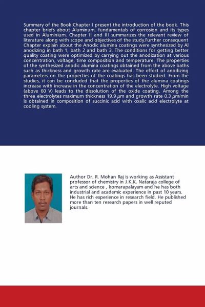 Summary of the Book:Chapter I present the introduction of the book. This chapter briefs about Aluminum, fundamentals of corrosion and its types used in Aluminium. Chapter II and III summarizes the relevant review of literature along with scope and objectives of the study.Further consequent Chapter explain about the Anodic alumina coatings were synthesized by Al anodizing in bath 1, bath 2 and bath 3. The conditions for getting better quality coating were optimized by carrying out the anodization at various concentration, voltage, time composition and temperature. The properties of the synthesized anodic alumina coatings obtained from the above baths such as thickness and growth rate are evaluated. The effect of anodizing parameters on the properties of the coatings has been studied. From the studies, it can be concluded that the properties of the alumina coatings increase with increase in the concentration of the electrolyte. High voltage (above 60 V) leads to the dissolution of the oxide coating. Among the three electrolytes maximum thickness 19.9 µm and growth rate 0.3 µm/min is obtained in composition of succinic acid with oxalic acid electrolyte at cooling system.
