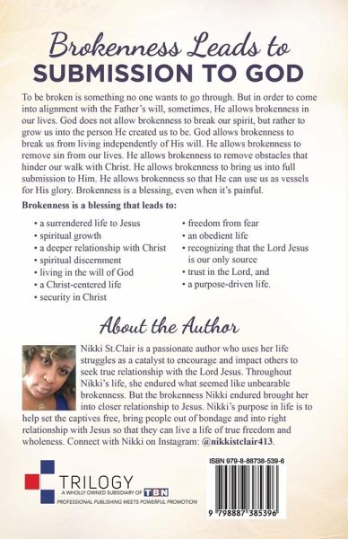 Brokenness Leads to Submission to God To be broken is something no one wants to go through. But in order to come into alignment with the Father's will, sometimes, He allows brokenness in our lives. God does not allow brokenness to break our spirit, but rather to grow us into the person He created us to be. God allows brokenness to break us from living independently of His will. He allows brokenness to remove sin from our lives. He allows brokenness to remove obstacles that hinder our walk with Christ. He allows brokenness to bring us into full submission to Him. He allows brokenness so that He can use us as vessels for His glory. Brokenness is a blessing, even when it's painful. Brokenness is a blessing that leads to a surrendered life to Jesus, spiritual growth, a deeper relationship with Christ, spiritual discernment, living in the will of God, a Christ-centered life, security in Christ, freedom from fear, an obedient life, recognizing that the Lord Jesus is our only source, trust in the Lord, and a purpose-driven life.