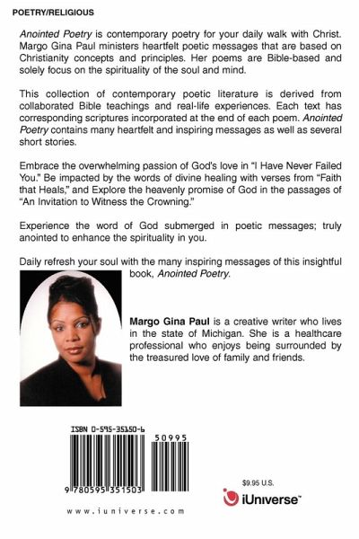 Anointed Poetry is contemporary poetry for your daily walk with Christ. Margo Gina Paul ministers heartfelt poetic messages that are based on Christianity concepts and principles. Her poems are Bible-based and solely focus on the spirituality of the soul and mind. This collection of contemporary poetic literature is derived from collaborated Bible teachings and real-life experiences. Each text has corresponding scriptures incorporated at the end of each poem. Anointed Poetry contains many heartfelt and inspiring messages as well as several short stories. Embrace the overwhelming passion of God's love in 'I Have Never Failed You." Be impacted by the words of divine healing with verses from 'Faith that Heals," and Explore the heavenly promise of God in the passages of 'An Invitation to Witness the Crowning." Experience the word of God submerged in poetic messages; truly anointed to enhance the spirituality in you. Daily refresh your soul with the many inspiring messages of this insightful book, Anointed Poetry.
