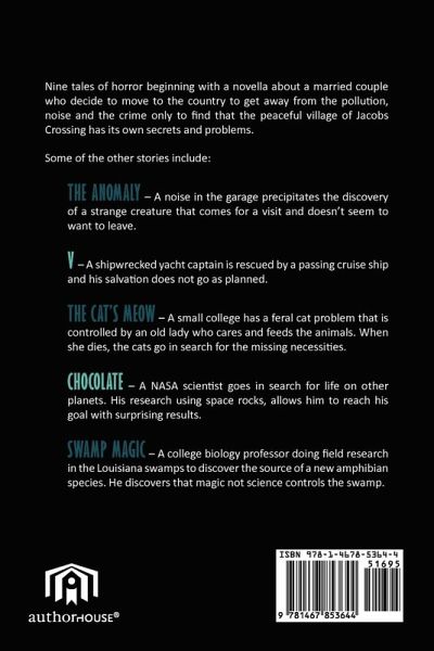 Nine tales of horror beginning with a novella about a married couple who decide to move to the country to get away from the pollution, noise and the crime only to find that the peaceful village of Jacobs Crossing has its own secrets and problems. Some of the other stories include: The Anomaly - A noise in the garage precipitates the discovery of a strange creature that comes for a visit and doesn't seem to want to leave. V - A shipwrecked yacht captain is rescued by a passing cruise ship and his salvation does not go as planned. The Cat's Meow - A small college has a feral cat problem that is controlled by an old lady who cares and feeds the animals. When she dies, the cats go in search for the missing necessities. Chocolate - A NASA scientist goes in search for life on other planets. His research using space rocks, allows him to reach his goal with surprising results. Swamp Magic - A college biology professor doing field research in the Louisiana swamps to discover the source of a new amphibian species. He discovers that magic not science controls the swamp.