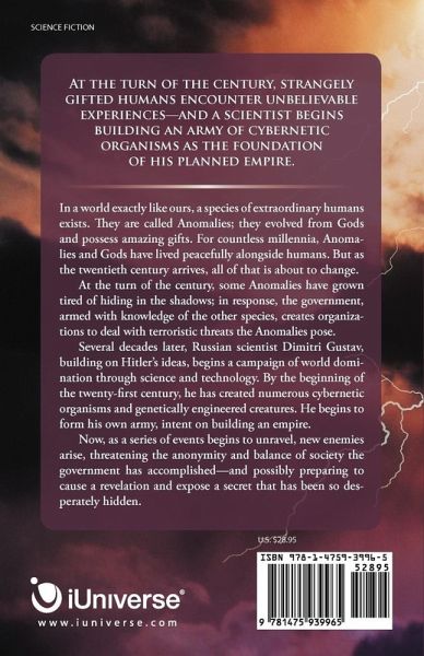 At the turn of the century, strangely gifted humans encounter unbelievable experiences-and a scientist begins building an army of cybernetic organisms as the foundation of his planned empire. In a world exactly like ours, a species of extraordinary humans exists. They are called Anomalies; they evolved from Gods and possess amazing gifts. For countless millennia, Anomalies and Gods have lived peacefully alongside humans. But as the twentieth century arrives, all of that is about to change. At the turn of the century, some Anomalies have grown tired of hiding in the shadows; in response, the government, armed with knowledge of the other species, creates organizations to deal with terroristic threats the Anomalies pose. Several decades later, Russian scientist Dimitri Gustav, building on Hitler's ideas, begins a campaign of world domination through science and technology. By the beginning of the twenty-first century, he has created numerous cybernetic organisms and genetically engineered creatures. He begins to form his own army, intent on building an empire. Now, as a series of events begins to unravel, new enemies arise, threatening the anonymity and balance of society the government has accomplished-and possibly preparing to cause a revelation and expose a secret that has been so desperately hidden.