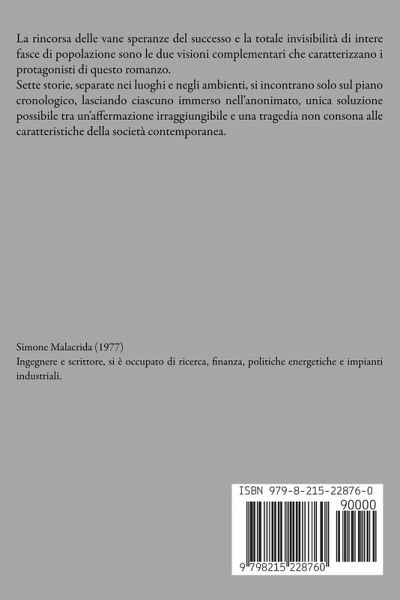 La rincorsa delle vane speranze del successo e la totale invisibilità di intere fasce di popolazione sono le due visioni complementari che caratterizzano i protagonisti di questo romanzo. Sette storie, separate nei luoghi e negli ambienti, si incontrano solo sul piano cronologico, lasciando ciascuno immerso nell'anonimato, unica soluzione possibile tra un'affermazione irraggiungibile e una tragedia non consona alle caratteristiche della società contemporanea.