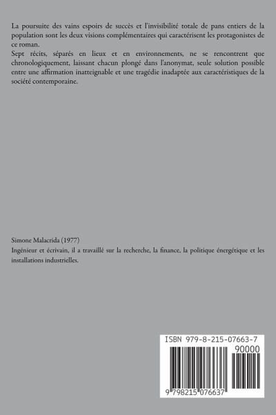 La poursuite des vains espoirs de succès et l'invisibilité totale de pans entiers de la population sont les deux visions complémentaires qui caractérisent les protagonistes de ce roman. Sept récits, séparés en lieux et en environnements, ne se rencontrent que chronologiquement, laissant chacun plongé dans l'anonymat, seule solution possible entre une affirmation inatteignable et une tragédie inadaptée aux caractéristiques de la société contemporaine.