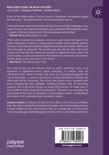 This book focuses on the different forms in which authorship came to be expressed in eighteenth-century Italian publishing. It analyses both the affirmation of the "author function", and, above all, its paradoxical opposite: the use of anonymity, a centuries-old practice present everywhere in Europe but often neglected by scholarship. The reasons why authors chose to publish their works anonymously were manifold, including prudence, fear of censorship, modesty, fear of personal criticism, or simple divertissement. In many cases, it was an ethical choice, especially for ecclesiastics. The Italian case provides a key perspective on the study of anonymity in the European context, contributing to the analysis of an overlooked topic in academic studies.