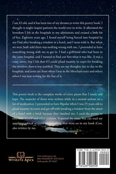 I am 43 old, and it has been one of my dreams to write this poetry book. I thought it might inspire patients the world over to write. It alleviated the boredom I felt in the hospitals in my admissions and created a little bit of fun. Eighteen years ago, I found myself being forced into hospital by my Dad after breaking a window in a hotel, and I went with it. But when we were both told there was nothing wrong with me, I pretended to have something wrong with me to get in. I had a girlfriend who had been in the same hospital, and I wanted to find out first what it was like. It was a crazy move, but I felt that if I could plead insanity in court for breaking the window, then it was justified. They are my thoughts day to day in the hospitals, and some are from when I was in the Merchant navy and others when I was just writing for the fun of it.