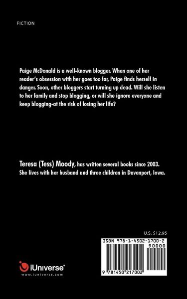 Paige McDonald is a well-known blogger. When one of her reader's obsession with her goes too far, Paige finds herself in danger. Soon, other bloggers start turning up dead. Will she listen to her family and stop blogging, or will she ignore everyone and keep blogging-at the risk of losing her life?