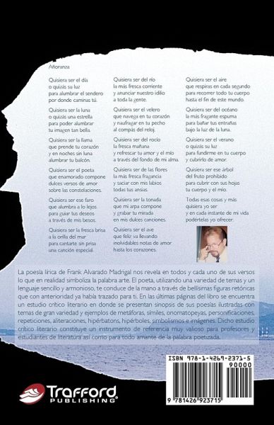 La poesía lírica de Frank Alvarado Madrigal nos revela en todos y cada uno de sus versos lo que en realidad simboliza la palabra arte. El poeta, utilizando una variedad de temas y un lenguaje sencillo y armonioso, te conduce de la mano a través de bellísimas figuras retóricas que con anterioridad ya había trazado para ti. En las últimas páginas del libro se encuentra un estudio crítico literario en donde se presentan sinopsis de sus poesías ilustradas con temas de gran variedad y ejemplos de metáforas, símiles, onomatopeyas, personificaciones, repeticiones, aliteraciones, hipérbatons, hipérboles, simbolismos e imágenes. Dicho estudio crítico literario constituye un instrumento de referencia muy valioso para profesores y estudiantes de literatura así como para todo amante de la palabra poetizada.