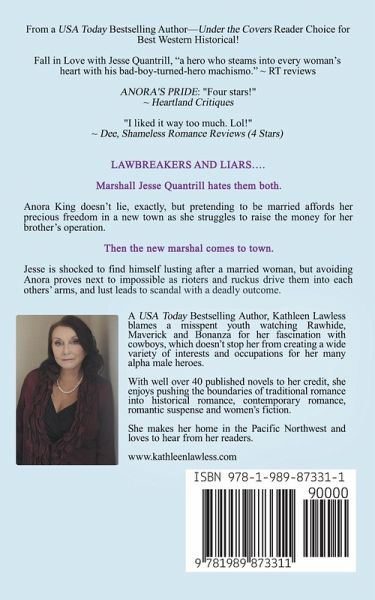 DON'T MISS UNDER THE COVERS READER CHOICE AWARD FOR BEST WESTERN HISTORICAL! Fall in Love with Jesse Quantrill, "a hero who steams into every woman's heart with his bad-boy-turned-hero machismo." RT Reviews LAWBREAKERS AND LIARS…. Marshall Jesse Quantrill hates them both. Anora King doesn't lie, exactly, but pretending to be married affords her precious freedom in a new town as she struggles to raise the money for her brother's operation. Then the new marshal comes to town. Jesse is shocked to find himself lusting after a married woman, but avoiding Anora proves next to impossible as rioters and ruckus drive them into each others' arms, and lust leads to scandal with a deadly outcome.