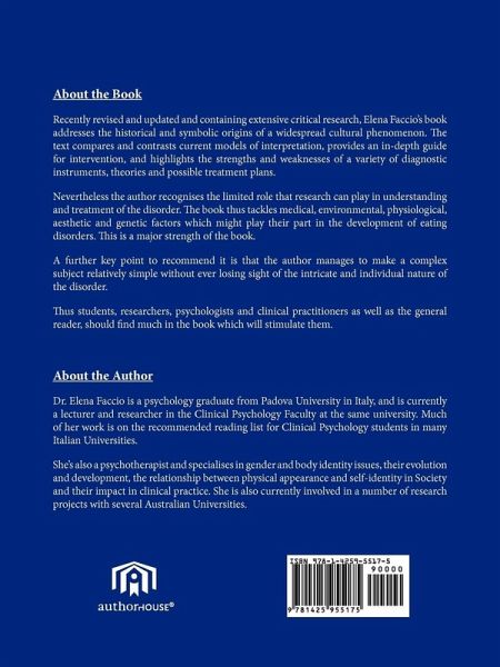 Recently revised and updated and containing extensive critical research, Elena Faccio's book addresses the historical and symbolic origins of a widespread cultural phenomenon. The text compares and contrasts current models of interpretation, provides an in-depth guide for intervention, and highlights the strengths and weaknesses of a variety of diagnostic instruments, theories and possible treatment plans, Nevertheless the author recognises the limited role that research can play in understanding and treatment of the disorder. The book thus tackles medical, environmental, physiological, aesthetic and genetic factors which might play their part in the development of eating disorders. This is a major strength of the book. A further key point to recommend it is that the author manages to make a complex subject relatively simple without ever losing sight of the intricate and individual nature of the disorder. Thus students, researchers, psychologists and clinical practitioners as well as the general reader, should find much in the book which will stimulate them.