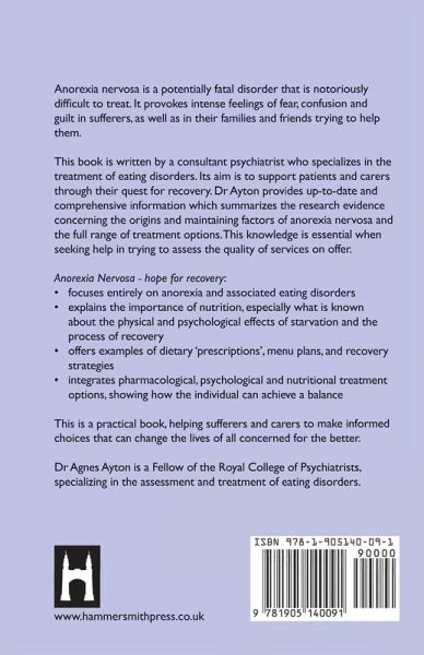 Anorexia nervosa is a potentially fatal disorder that is notoriously difficult to treat. It provokes intense feelings of fear, confusion and guilt in sufferers as well as in their families and friends trying to understand and help them. Based on long experience, Dr Ayton: Explains the importance of nutrition, especially what is known about the physical and psychological effects of starvation and the process of recovery; Offers examples of dietary 'prescriptions', menu plans and recovery strategies; Integrates pharmacological, psychological and nutritional treatment options, showing how the individual can achieve a balance. This is a practical book helping sufferers and carers to make informed choices that can change the lives of all concerned for the better.