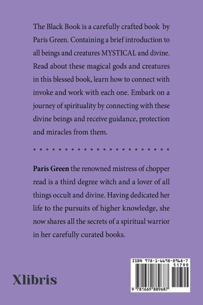 The Black Book is a carefully crafted book by Paris Green. Containing a brief introduction to all beings and creatures MYSTICAL and divine. Read about these magical gods and creatures in this blessed book, learn how to connect with invoke and work with each one. Embark on a journey of spirituality by connecting with these divine beings and receive guidance, protection and miracles from them.