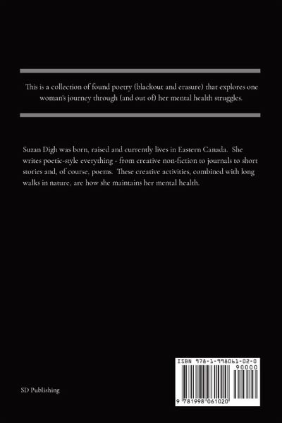 The poems are free-verse blackout and erasure poems "found" in an early draft of a creative non-fiction story about the struggles that stemmed from one lesbian's coming out experience. These struggles included mental health concerns, confusion around sexual identity and acceptance, finding oneself, and overcoming substance misuse. The poetry is dark, because the experience of coming out in a small rural town and being medically "treated" for being gay is a dark topic. These poems have also been published (without the original blacked-out images) in Out in the Dark: a queer road to mental health.