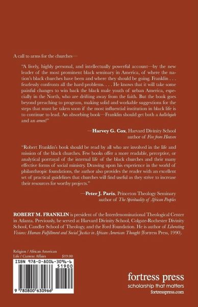 Robert M. Franklin is Distinguished Professor of Social Ethics at Emory University. He has also served at the University of Chicago, Harvard Divinity School, Colgate-Rochester Divinity School, and the Interdenominational Theological Center, Atlanta, as well as at the Ford Foundation. His prior books from Fortress Press include Liberating Visions: Human Fulfillment and Social Justice in African-American Thought (1990, 0-8006-2392-4) and Another Day's Journey: Black Churches Confronting the American Crisis (1997, 0-8006-3096-3). A frequent commentator on public radio's "All Things Considered" he lives in Atlanta, Georgia.