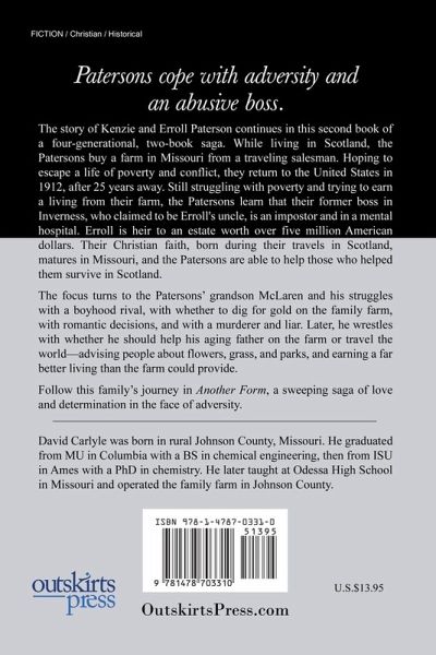 Patersons cope with adversity and an abusive boss. The story of Kenzie and Erroll Paterson continues in this second book of a four-generational, two-book saga. While living in Scotland, the Patersons buy a farm in Missouri from a traveling salesman. Hoping to escape a life of poverty and conflict, they return to the United States in 1912, after 25 years away. Still struggling with poverty and trying to earn a living from their farm, the Patersons learn that their former boss in Inverness, who claimed to be Erroll's uncle, is an impostor and in a mental hospital. Erroll is heir to an estate worth over five million American dollars. Their Christian faith, born during their travels in Scotland, matures in Missouri, and the Patersons are able to help those who helped them survive in Scotland. The focus turns to the Patersons' grandson McLaren and his struggles with a boyhood rival, with whether to dig for gold on the family farm, with romantic decisions, and with a murderer and liar. Later, he wrestles with whether he should help his aging father on the farm or travel the world-advising people about flowers, grass, and parks, and earning a far better living than the farm could provide. Follow this family's journey in Another Form, a sweeping saga of love and determination in the face of adversity.