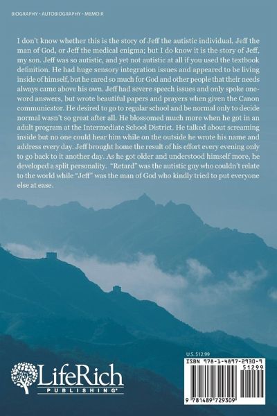 I don't know whether this is the story of Jeff the autistic individual, Jeff the man of God, or Jeff the medical enigma; but I do know it is the story of Jeff, my son. Jeff was so autistic, and yet not autistic at all if you used the textbook definition. He had huge sensory integration issues and appeared to be living inside of himself, but he cared so much for God and other people that their needs always came above his own. He had severe speech issues, only spoke one-word answers, but wrote beautiful papers and prayers when given the Canon communicator. He desired to go to regular school and be normal only to decide normal wasn't so great after all and he blossomed much more when he got in an adult program at the Intermediate School District. He talked about screaming inside but no one could hear him while on the outside he wrote his name and address every day and brought home the result of his effort every evening only to go back to it another day. As he got older and understood himself more, he developed a split personality. Retard was the autistic guy who couldn't relate to the world while Jeff was the man of God who kindly tried to put everyone else at ease.