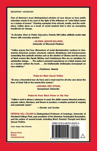 An ambitious book on how schools, race, and the media intertwine in the twenty-first century Sociologist Patricia Hill Collins opens this brilliant new book on race and education by describing how in her senior year at the Philadelphia High School for girls, near the end of a public school education that "had almost silenced me," she was invited to deliver a graduation address on the meaning of the American flag. She refused to deliver the censored version her teacher demanded, and someone else took her place on stage. Another Kind of Public Education spins the threads of that story-the way education, race, and democracy are intertwined; the way racism and resistance work through a variety of unspoken means; what schools do to limit or to open up possibilities-into a call for "another kind of public education," one that helps us "envision new democratic possibilities." Collins begins, in a tour de force of social analysis with practical implications, by demystifying what she calls "racism as a system of power." She argues that the generation coming of age at the turn of the twenty-first century-in a post-civil-rights society that publicly claims to be "color-blind"-needs a new language for analyzing the new "color-blind racism" of contemporary society that has stymied efforts to live up to the promise of American democracy. She shows us how racism as a system of power works in four distinct yet intertwined domains-structural, disciplinary, cultural, and interpersonal. Drawing examples from schools, politics, pop culture, personal experience, and more, she demonstrates in eye-opening ways how racial inequality is manufactured and reinforced, even as we publicly espouse an ideology of color-blind fairness. And she points, crucially, to what we can do about it. Noting that everyone is situated differently in the complex domains of power, she urges us to "think expansively about resistance," to figure out in which domain we can have the most effect in resisting racism as a system of power, and how. She also discusses classrooms around the country, teaching as a subversive activity, "cultivating countersurveillance," and the power of storytelling and media. Blending entertaining storytelling, social theory, and practical suggestions for changing institutions, including schools, Another Kind of Public Education is both a call for change and a reminder that public education-in every sense-is at the heart of American democratic possibilities.