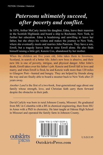 Patersons ultimately succeed, after poverty and conflict. In 1876, Arthur McCarty insists his daughter, Edna, leave their mansion in the Scottish Highlands and board a ship to Rochester, New York, to further her education. Edna is headstrong and unwilling to leave her father, but she obeys his wishes and makes the journey to New York, where she eventually meets and marries John Paterson. They have a son, Erroll, but a tragedy leaves John to raise Erroll alone. He also finds himself raising a little girl, Kenzie Cox, abandoned by her mother. When the children are five years old, John takes them to Inverness, Scotland, in search of a better life. John's new boss is abusive, and their new life is one of poverty, intrigue, and physical danger. After John's death, Erroll takes over his father's job. Kenzie and Erroll fall in love and marry, and when Erroll is fired, he and Kenzie walk more than 120 miles to Glasgow Port-hunted and hungry. They are helped by friends along the way and are finally able to board a steamer back to New York after 25 years away. Another Land is the first of a two-book, four-generational saga about one family whose strength, love, and Christian faith carry them forward despite the obstacles in their path.