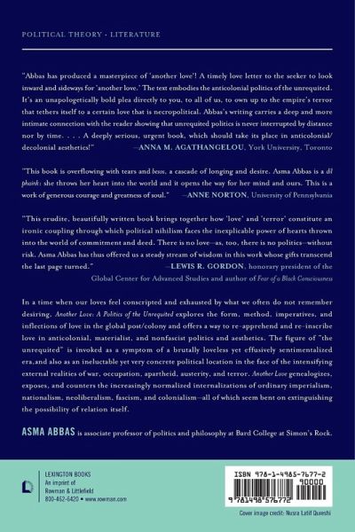 In a time when our loves feel conscripted and exhausted by what we often do not remember desiring, Another Love: A Politics of the Unrequited explores the form, method, imperatives, and inflections of love in the global post colony, and offers a way to re-apprehend and re-inscribe love in an anticolonial, materialist, and nonfascist politics and aesthetics. The figure of "the unrequited" is invoked as a symptom of a brutally loveless yet effusively sentimentalized era, and also as an ineluctable yet very concrete political location in the face of both the intensifying external realities of war, occupation, apartheid, austerity, and terror, as well as the increasingly normalized internalizations of ordinary imperialism, nationalism, neoliberalism, fascism, and colonialism-all of which seem bent on extinguishing the possibility of relation itself. The book asks that we look at practices of love and other material labors that yield and sustain these realities within complex lifeworlds; indeed, those which sustain entire systems of our subjection, extraction, and disposability-such as colonialism, capitalism, liberalism, and fascism-as lifeworlds, especially when given, dominant, forms of recognition, affection, embrace, and belonging are unacceptable or even repulsive. Distancing itself from shortcuts afforded by love's abstract forms deployed in ethical and moral discourses that at once elevate it yet wholly reduce it to a timeless, apolitical, essence, Another Love sees love as a material and political relation to time and space, signaling willed and unwilled shifts in historical reality in societies juggling various wars and annihilations. It maintains that love is something in and with which we confess our complicities not only with but also against hegemonic notions of belonging, devotion, martyrdom, hospitality, publicity, collectivity, and solidarity nurtured and harvested under capital and colony. The longing and the love-missed by the pernicious and reactionary politics both of liberal democracy and the incidental fascisms that it claims to set out to fix-can give us clues into past, present, and future, moments of rebellion, resistance, rejection, and redemption that are crucial to a liberatory, anticolonial, and antifascist politic, and to rethinking attachment, desire, and relation itself.