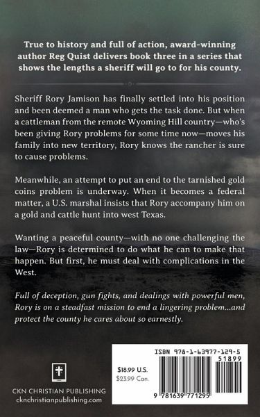 "True to history and full of action, award-winning author Reg Quest delivers book three in a series that shows the lengths a sheriff will go to for his county. Sheriff Rory Jamison has finally settled into his position and been deemed a man who gets the task done. But when a cattleman from the remote Wyoming Hill country-who's been giving Rory problems for some time now-moves his family into new territory, Rory knows the rancher is sure to cause problems. Meanwhile, an attempt to put an end to the tarnished gold coins problem is underway. When it becomes a federal matter, a U.S. marshal insists that Rory accompany him on a gold and cattle hunt into west Texas. Wanting a peaceful county-with no one challenging the law-Rory is determined to do what he can to make that happen. But first, he must deal with complications in the West. Full of deception, gun fights, and dealings with powerful men, Rory is on a steadfast mission to end a lingering problem...and protect the county he cares about so earnestly"--