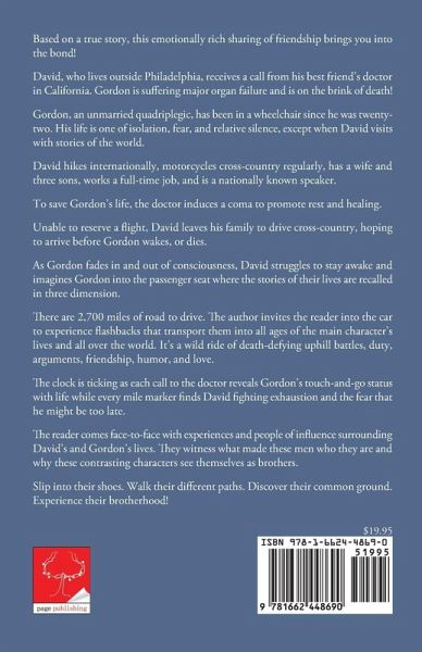 Based on a true story, this emotionally rich sharing of friendship brings you into the bond!David, who lives outside Philadelphia, receives a call from his best friend's doctor in California. Gordon is suffering major organ failure and is on the brink of death!Gordon, an unmarried quadriplegic, has been in a wheelchair since he was twenty-two. His life is one of isolation, fear, and relative silence, except when David visits with stories of the world.David hikes internationally, motorcycles cross-country regularly, has a wife and three sons, works a full-time job, and is a nationally known speaker.To save Gordon's life, the doctor induces a coma to promote rest and healing.Unable to reserve a flight, David leaves his family to drive cross-country, hoping to arrive before Gordon wakes, or dies.As Gordon fades in and out of consciousness, David struggles to stay awake and imagines Gordon into the passenger seat where the stories of their lives are recalled in three dimension.There are 2,700 miles of road to drive. The author invites the reader into the car to experience flashbacks that transport them into all ages of the main character's lives and all over the world. It's a wild ride of death-defying uphill battles, duty, arguments, friendship, humor, and love.The clock is ticking as each call to the doctor reveals Gordon's touch-and-go status with life while every mile marker finds David fighting exhaustion and the fear that he might be too late.The reader comes face-to-face with experiences and people of influence surrounding David's and Gordon's lives. They witness what made these men who they are and why these contrasting characters see themselves as brothers.Slip into their shoes. Walk their different paths. Discover their common ground. Experience their brotherhood!