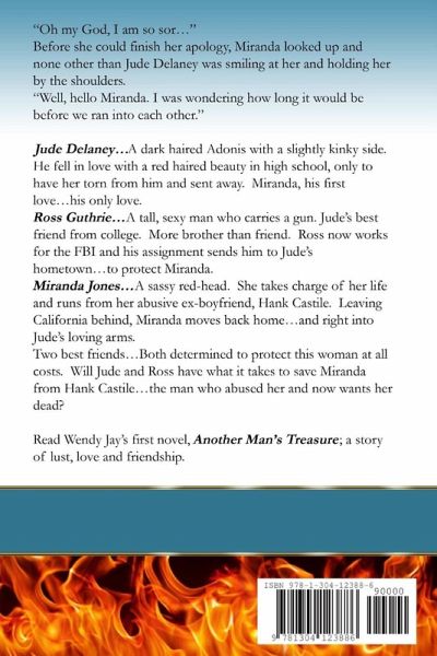 Jude Delaney...A dark haired Adonis with a slightly kinky side. He fell in love with a red haired beauty in high school, only to have her torn from him and sent away. Miranda, his first love...his only love. Ross Guthrie...A tall, sexy man who carries a gun. Jude's best friend from college. More brother than friend. Ross now works for the FBI and his assignment sends him to Jude's hometown...to protect Miranda. Miranda Jones...A sassy red-head. She takes charge of her life and runs from her abusive ex-boyfriend, Hank Castile. Leaving California behind, Miranda moves back home...and right into Jude's loving arms. Two best friends...Both determined to protect this woman at all costs. Will Jude and Ross have what it takes to save Miranda from Hank Castile...the man who abused her and now wants her dead? Read Wendy Jay's first novel, Another Man's Treasure; a story of lust, love and friendship.