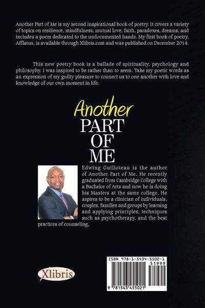 Another Part of Me is my second inspirational book of poetry. It covers a variety of topics on resilience, mindfulness, mutual love, faith, paradoxes, dreams, and includes a poem dedicated to the undocumented hands. My first book of poetry, Afflatus, is available through Xlibris.com and was published on December 2014. This new poetry book is a ballade of spirituality, psychology and philosophy. I was inspired to be rather than to seem. Take my poetic words as an expression of my guilty pleasure to connect us to one another with love and knowledge of our own moment in life.