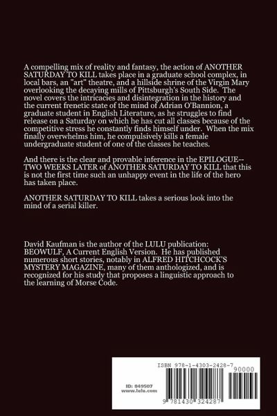A compelling mix of reality and fantasy, the action of ANOTHER SATURDAY TO KILL takes place in a graduate school complex, in local bars, an "art" theatre, and a hillside shrine of the Virgin Mary overlooking the decaying mills of Pittsburgh's South Side. The novel covers the intricacies and disintegration in the history and the current state of the mind of Adrian O'Bannion, a graduate student in English Literature, as he struggles to find release on a Saturday on which he has cut all classes because of the competitive stress he constantly finds himself under. Late in the day, when the mix finally overwhelms him, he compulsively kills a female undergraduate of one of the classes he teaches. And there is the clear and proveable inference in the EPILOGUE -- TWO WEEKS LATER of ANOTHER SATURDAY TO KILL that this is not the first time such an unhappy event in the life of the hero has taken place. ANOTHER SATURDAY TO KILL takes a serious look into the mind of a serial killer.