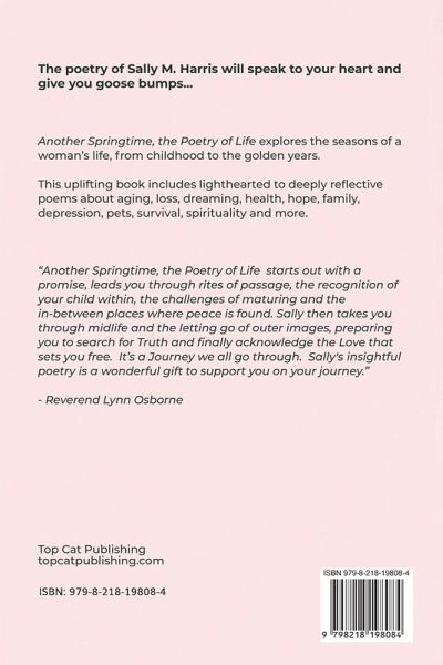 The poetry of Sally M. Harris will pull at your soul, speak to your heart and sometimes give you goose bumps. Another Springtime, the Poetry of Life is a beautiful collection of verses exploring the seasons of a woman's life from childhood to the golden years. The book includes lighthearted to deeply reflective poems about aging, loss, dreaming, health, family, survival, depression, hope, spirituality, pets and more. " Another Springtime, the Poetry of Life starts out with a promise, leads you through rites of passage, the recognition of your child within, the challenges of maturing and the in-between places where peace is found. Sally then takes you through midlife and the letting go of outer images, preparing you to search for Truth and finally acknowledge the Love that sets you free. It's a Journey we all go through. Sally's insightful poetry is a wonderful gift to support you on your journey." - Reverend Lynn Osborne