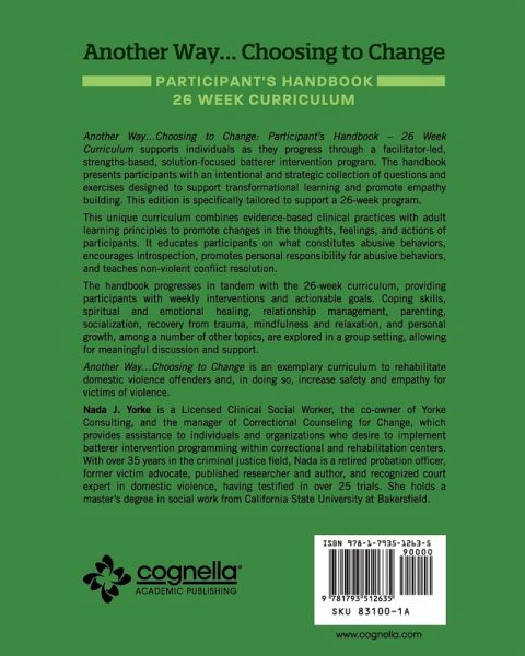 Another Way...Choosing to Change: Participant's Handbook - 26 Week Curriculum supports individuals as they progress through a facilitator-led, strengths-based, solution-focused batterer intervention program. The handbook presents participants with an intentional and strategic collection of questions and exercises designed to support transformational learning and promote empathy building. This edition is specifically tailored to support a 26-week program. This unique curriculum combines evidence-based clinical practices with adult learning principles to promote changes in the thoughts, feelings, and actions of participants. It educates participants on what constitutes abusive behaviors, encourages introspection, promotes personal responsibility for abusive behaviors, and teaches non-violent conflict resolution. The handbook progresses in tandem with the 26-week curriculum, providing participants with weekly interventions and actionable goals. Coping skills, spiritual and emotional healing, relationship management, parenting, socialization, recovery from trauma, mindfulness and relaxation, and personal growth, among a number of other topics, are explored in a group setting, allowing for meaningful discussion and support. Another Way...Choosing to Change is an exemplary curriculum to rehabilitate domestic violence offenders and, in doing so, increase safety and empathy for victims of violence. Nada J. Yorke is a Licensed Clinical Social Worker, the co-owner of Yorke Consulting, and the manager of Correctional Counseling for Change, which provides assistance to individuals and organizations who desire to implement batterer intervention programming within correctional and rehabilitation centers. With over 35 years in the criminal justice field, Nada is a retired probation officer, former victim advocate, published researcher and author, and recognized court expert in domestic violence, having testified in over 25 trials. She holds a master's degree in social work from California State University at Bakersfield.