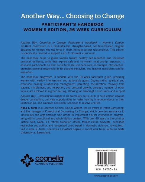 Another Way...Choosing to Change: Participant's Handbook - Women's Edition, 26 Week Curriculum is a facilitator-led, strengths-based, solution-focused program designed for women who use force in their intimate partner relationships. This edition is specifically tailored to support a 26- to 30-week curriculum. The handbook helps to guide women toward healthy self-reflection and increased personal resiliency, while they explore safe and nonviolent relationship responses. It educates participants on what constitutes abusive behaviors, encourages introspection, promotes personal responsibility for abusive behaviors, and teaches nonviolent conflict resolution. The handbook progresses in tandem with the 26-week facilitator guide, providing women with weekly interventions and actionable goals. Coping skills, spiritual and emotional healing, relationship management, parenting, socialization, recovery from trauma, mindfulness and relaxation, and personal growth, among a number of other topics, are explored in a group setting, allowing for meaningful discussion and support. Another Way...Choosing to Change is an exemplary curriculum to help women develop deeper connection, cultivate opportunities to foster healthy interdependence in their relationships, and embrace nonviolent solutions to resolve conflict.