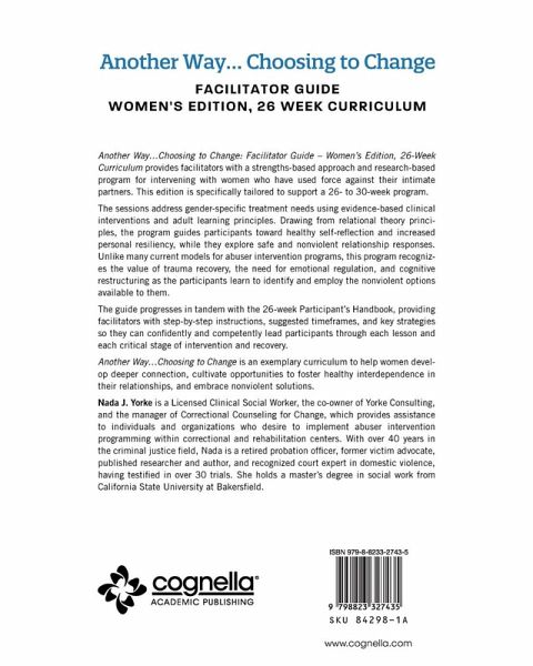 Another Way...Choosing to Change: Facilitator Guide - Women's Edition, 26 Week Curriculum provides facilitators with a strengths-based approach and research-based program for intervening with women who have used force against their intimate partners. This edition is specifically tailored to support a 26- to 30-week program. The sessions address gender-specific treatment needs using evidence-based clinical interventions and adult learning principles. Drawing from relational theory principles, the program guides participants toward healthy self-reflection and increased personal resiliency, while they explore safe and nonviolent relationship responses. Unlike many current models for abuser intervention programs, this program recognizes the value of trauma recovery, the need for emotional regulation, and cognitive restructuring as the participants learn to identify and employ the nonviolent options available to them. The guide progresses in tandem with the 26-week Participant's Handbook, providing facilitators with step-by-step instructions, suggested timeframes, and key strategies so they can confidently and competently lead participants through each lesson and each critical stage of intervention and recovery. Another Way...Choosing to Change is an exemplary curriculum to help women develop deeper connection, cultivate opportunities to foster healthy interdependence in their relationships, and embrace non-violent solutions.