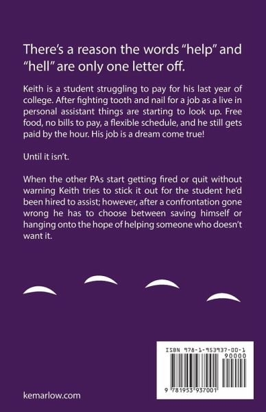 There's a reason the words "help" and "hell" are only one letter off. Keith is a student struggling to pay for his last year of college. After fighting tooth and nail for a job as a live in personal assistant things are starting to look up. Free food, no bills to pay, a flexible schedule, and he still gets paid by the hour. His job is a dream come true! Until it isn't. When the other PAs start getting fired or quit without warning Keith tries to stick it out for the student he'd been hired to assist; however, after a confrontation gone wrong he has to choose between saving himself or hanging onto the hope of helping someone who doesn't want it.