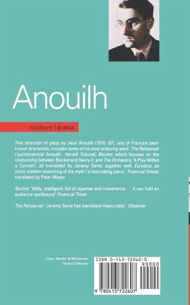 A selection of the most enduring work of one of this century's best-known French playwrights This selection of plays by Jean Anouilh (1910-87), includes The Rehearsal ('quintissential Anouilh', Herald Tribune); Becket ('witty, intelligent, full of repartee and irreverence' Financial Times); The Orchestra (a play within a concert), together with Eurydice, an ironic modern reworkng of the myth ('a fascinating piece', Financial Times). "Anouilh is a poet but not a poet of words, he is a poet of words-acted, of scenes-set, of players-performing." (Peter Brook)