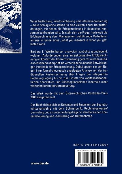 Barbara E. Weißenberger analysiert zunächst grundlegend, welchen Anforderungen eine anreizkompatible Erfolgsrechnung im Kontext der Konzernsteuerung gerecht werden muss. Anschließend überprüft sie verschiedene aktuelle Entwicklungen innerhalb der Erfolgsrechnung. Dabei spannt sie den Bogen ihrer formal-theoretisch angelegten Analyse von der traditionellen Kostenrechnung über Fragen der integrierten Rechnungslegung bis hin zum Einsatz von kapitalmarktorientierten Kennzahlen und Aktienoptionsplänen innerhalb einer wertorientierten Konzernsteuerung.