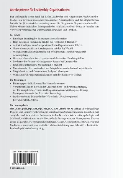 Der vorliegende siebte Band der Reihe Leadership und Angewandte Psychologie beleuchtet die Grenzen klassischer (finanzieller) Anreizsysteme und die Möglichkeiten holistischer (immaterieller) Anreizsysteme, die die gesamte Organisation betreffen. Neben wissenschaftlichen Beiträgen finden sich konkrete Next-Practice-Impulse von Vertretern verschiedener Unternehmensbranchen und -größen.