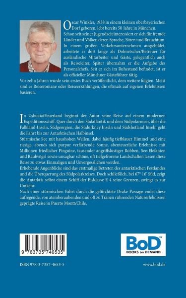In Ushuaia/Feuerland beginnt der Autor seine Reise auf einem modernen Expeditionsschiff. Quer durch den Südatlantik und dem Südpolarmeer, über die Falkland-Inseln, Südgeorgien, die Südorkney Inseln und Südshetland Inseln geht die Fahrt bis zur Antarktischen Halbinsel.Stürmische See mit haushohen Wellen, dabei häufig tiefblauer Himmel und eine riesige, abends sich purpur verfärbende Sonne, abenteuerliche Erlebnisse mit Millionen friedlicher Pinguine, tausender angriffslustiger Robben, See-Elefanten und Raubvögel sowie unsagbar schöne, oft tiefgefrorene Landschaften lassen diese Reise zu etwas Einmaligen und Unvergesslichen werden.Erhebende Augenblicke sind das erstmalige Betreten des antarktischen Festlandes und die Überquerung des Südpolarkreises. Doch schließlich, bei 67° 16' Süd, zeigt die Antarktis selbst einem Schiff der Eisklasse E 4 seine Grenzen, zwingt es zur Umkehr.Nach einer stürmischen Fahrt durch die gefürchtete Drake Passage endet diese aufregende, von atemberaubenden und oft zu Tränen rührenden Naturerlebnissen geprägte Reise in Puerto Montt/Chile.