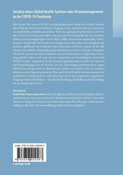 Mit Anlauf der ersten COVID-19-Impfprogramme stellte sich schnell heraus, dass Teile der Welt einen leichteren Zugang zu den unter Hochdruck entwickelten Impfstoffen erhielten als andere. Trotz der globalen Impfinitiative COVAX, die es sich zum Ziel gesetzt hatte, eine gerechte Verteilung für alle zu erreichen, bildete sich ein ausgeprägtes Nord-Süd-Gefälle. Eine derart ungerechte Verteilung der Impfstoffe wirft nicht nur Fragen internationaler Gerechtigkeit auf, sondern gefährdet die Sicherheit aller Menschen weltweit, indem sie für alle Länder eine effektive Bekämpfung der Pandemie erschwert oder gar verhindert. Das Buch untersucht daher Faktoren, die zur beobachteten ungleichen Verteilung geführt haben und zeigt auf, wo Ansprüche an Gerechtigkeit noch nicht erfüllt wurden. Angelehnt an die Forschungserkenntnisse endet die Autorin mit Empfehlungen für die Politik, um bei zukünftigen pandemischen Lagen effektivere und gerechtere Maßnahmen treffen zu können. Für die Analyse wurden sechs Expertenpanels des Harvard Global Health Institute anhand der qualitativen Inhaltsanalyse nach Mayring (2015) theoriegeleitet ausgewertet. Eingang finden alle Phasen - von der Entwicklung, Produktion und Verteilung bis zur Impfung vor Ort.