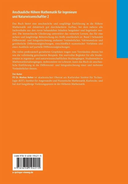 Die vielen professionell gestalteten Graphiken tragen zum Verständnis ebenso bei wie die vollständig gerechneten Beispiele. Ein wertvoller Begleiter für alle Studierenden in ingenieur- und naturwissenschaftlichen Studiengängen. Studierenden in Mathematikstudiengängen, insbesondere im Lehramt, kann das Buch als anschauliche Einführung in die Differenzial- und Integralrechnung einer und mehrerer Veränderlicher dienen.