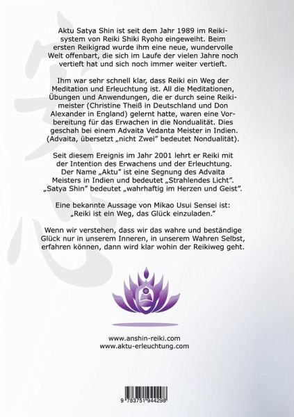 Anshin Reiki als Erleuchtungsweg erweckt in jedem Menschen sein von Geburt an angelegtes Potenzial, in Freiheit zu leben und beides, sein Wahres Selbst und sein Potenzial zu manifestieren. Anshin Reiki ist ein spiritueller Weg, der jeden Menschen in die Tiefe seines eigenen Wesens führt, um Frieden im Herzen und Klarheit im Geist zu finden. Es geht in diesem Buch vor allem darum, die drei Aspekte der geistigen Philosophie von Anshin Reiki ins kollektive Bewusstsein zu rufen, um Möglichkeiten zur Transformation aufzuzeigen. Das spirituelle Verständnis für die fünf Reiki Lebensprinzipien vertieft sich. Anshin Reiki vermittelt, dass Freiheit und Glückseligkeit bereits in jedem Menschen angelegt sind und darauf warten, entdeckt zu werden. Wenn wir Menschen verstehen, dass wir das wahre und beständige Glück nur in unserem Inneren, in unserem Wahren Selbst erfahren können, wird klar, dass Anshin Reiki ein Weg zur Erleuchtung ist und zu Freiheit führt. Anshin Reiki gibt uns die Möglichkeit, unser Leben auf eine höhere Ebene zu transzendieren, damit wir mit einem erleuchteten Bewusstsein ein erfülltes Leben in wahrhaftiger Glückseligkeit leben können. Das spirituelle Heilungsbiotop bekommt dadurch eine neue Bedeutung für die Transformation der Gesellschaft.